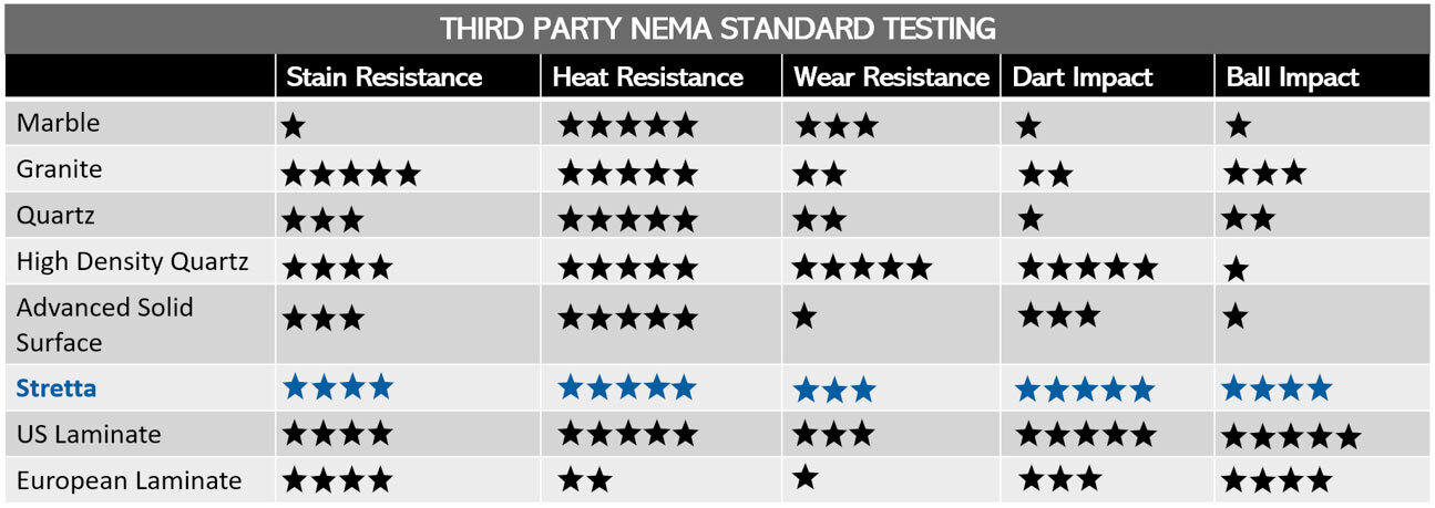 Stretta countertops don't just look great — they perform great too! The chart below represents this third-party NEMA testing on several different types of countertops including Stretta.